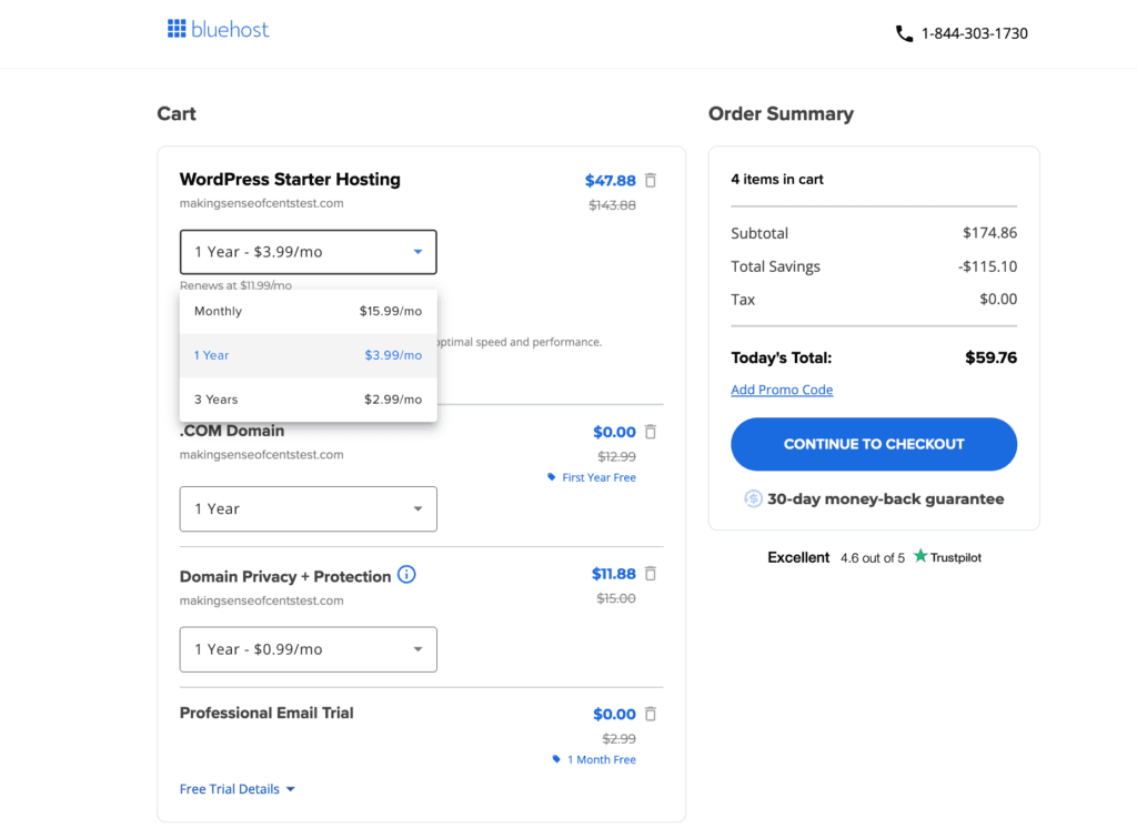 • Other than the above, you do not need the other items that Bluehost sells, so I would uncheck any of the extras that are listed.